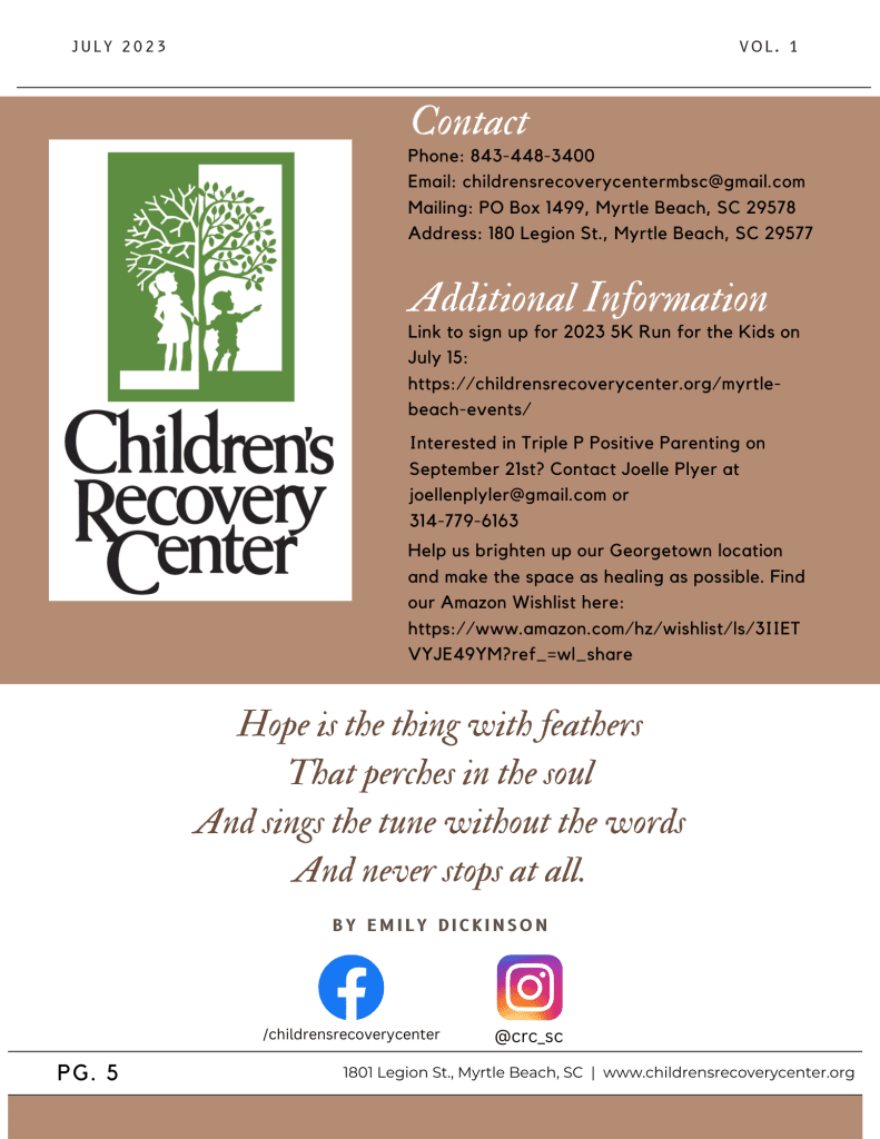 843-448-3400 1801 Legion St, Myrtle Beach, SC 29577 2305 Highmarket St, Georgetown, SC 29440 Tax ID: 57-1047247 Privacy Policy | Terms & Conditions Copyright © 2025 Children's Recovery Center | Web Design by: Three Ring Focus